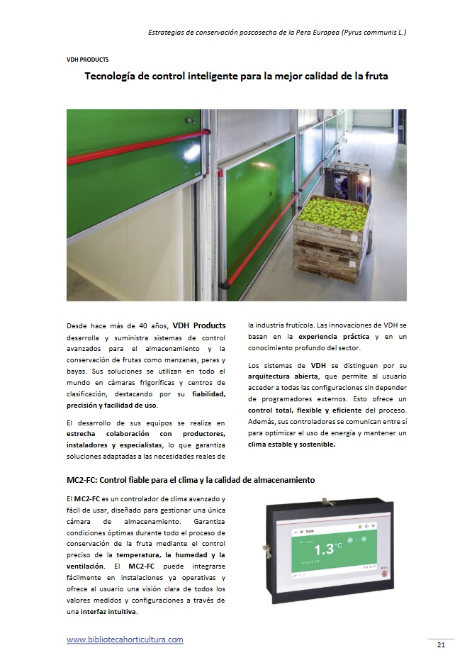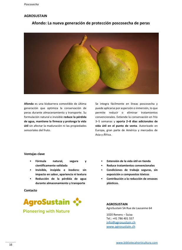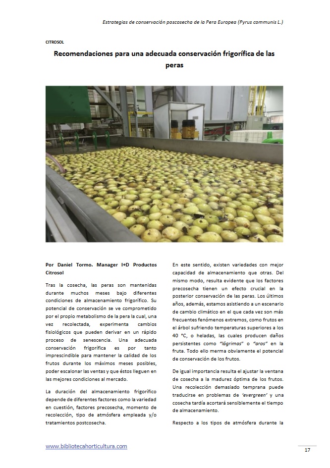 La pera (Pyrus spp.) representa uno de los cultivos frutales más relevantes a nivel mundial, no solo por su valor nutricional sino también por su importancia económica. Este artículo presenta una revisión detallada sobre los principales factores que afectan su conservación postcosecha, incluyendo las condiciones de cultivo, el estado de madurez al momento de la cosecha, la influencia varietal y genética, así como los principales desafíos durante el almacenamiento. Asimismo, se analizan tecnologías actuales y emergentes para alargar su vida útil y preservar su calidad, con especial énfasis en el uso de 1-MCP, atmósferas controladas, recubrimientos comestibles, tratamientos no térmicos y herramientas digitales para monitoreo en tiempo real. Finalmente, se discuten las perspectivas futuras ante retos como el cambio climático y la sostenibilidad alimentaria.