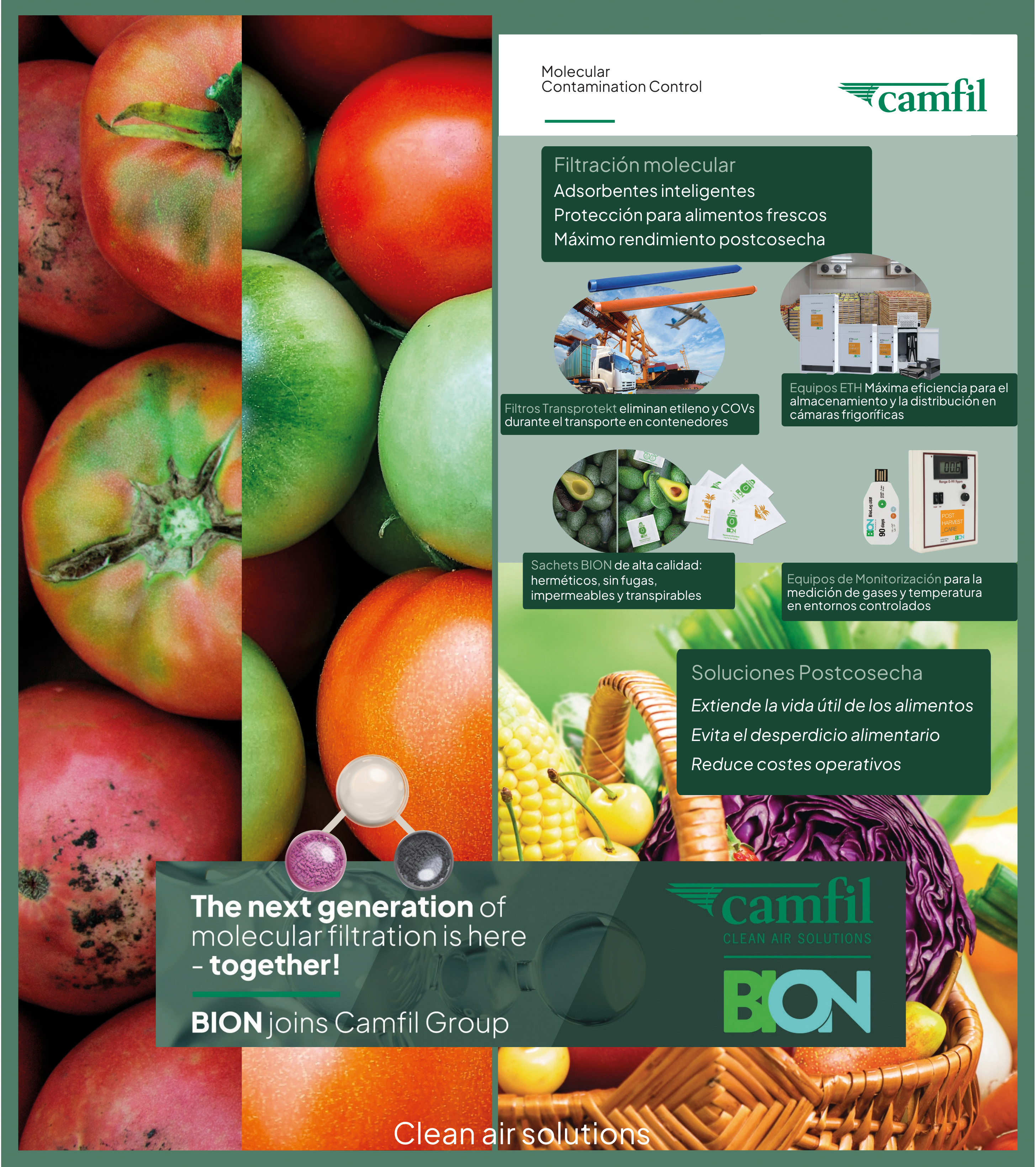 Con la unión de BION y Camfil, ambas compañías suman casi 100 años de experiencia en filtración molecular, combinando conocimiento, capacidad industrial e innovación para ofrecer soluciones de postcosecha que ayudan a la industria hortofrutícola a producir, transportar y distribuir alimentos de forma más responsable y sostenible.