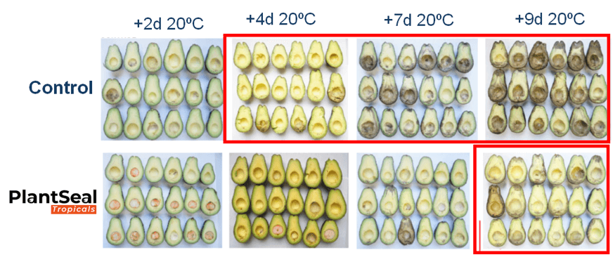 En la imagen se muestran parte de los resultados obtenidos por el IVIA en palta de la variedad Lamb Hass, donde se observa cómo la palta tratada con PlantSeal® Tropicals presenta una mayor vida en anaquel y menor pardeamiento interno respecto a la palta sin recubrimiento, incluso después de 9 días a 20 ºC.