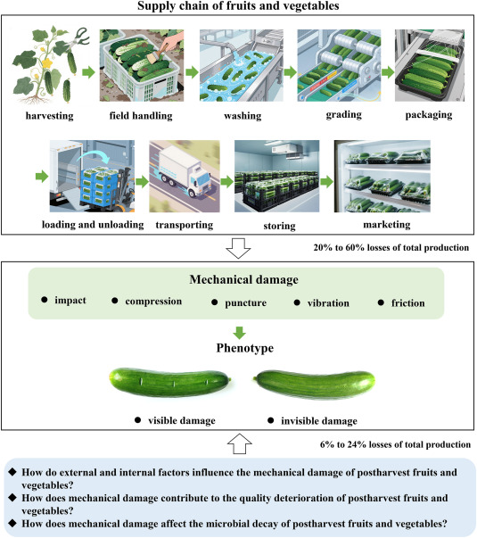 Explora sistemáticamente el efecto de los daños mecánicos en el deterioro de la calidad de las frutas y verduras, incluyendo el agua, la textura, el color, la nutrición, el sabor y la senescencia. Se analiza la relación entre el daño mecánico y la carga microbiana, lo que produce descomposición, revelando los mecanismos por los cuales el daño mecánico promueve la infección por patógenos.