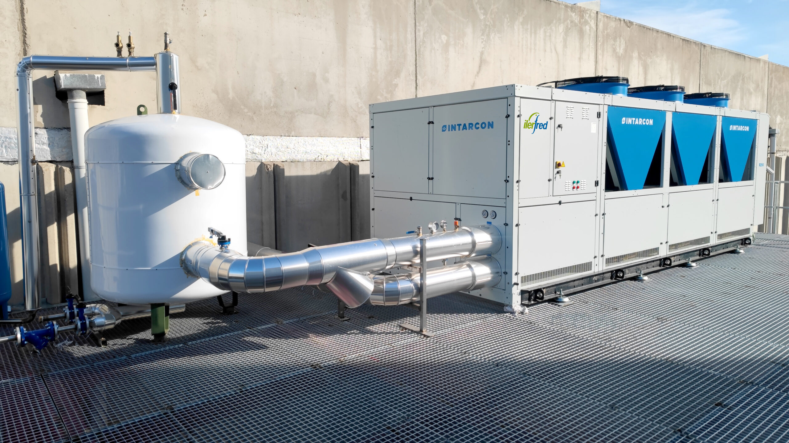 La instalación cuenta con una planta enfriadora de propano R-290 condensada por aire, con una capacidad frigorífica de 300 kW.
