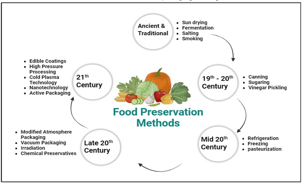 Las técnicas de conservación de alimentos evolucionaron con el tiempo desde el secado al sol hasta el envasado activo (Fig 1. del artículo original)
