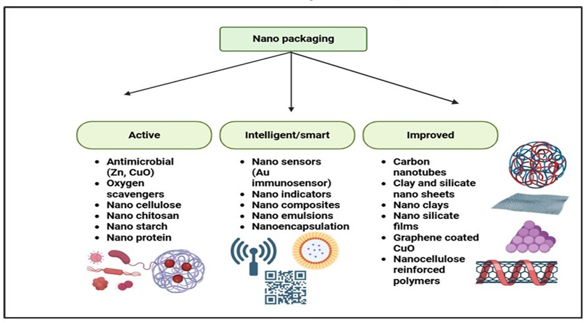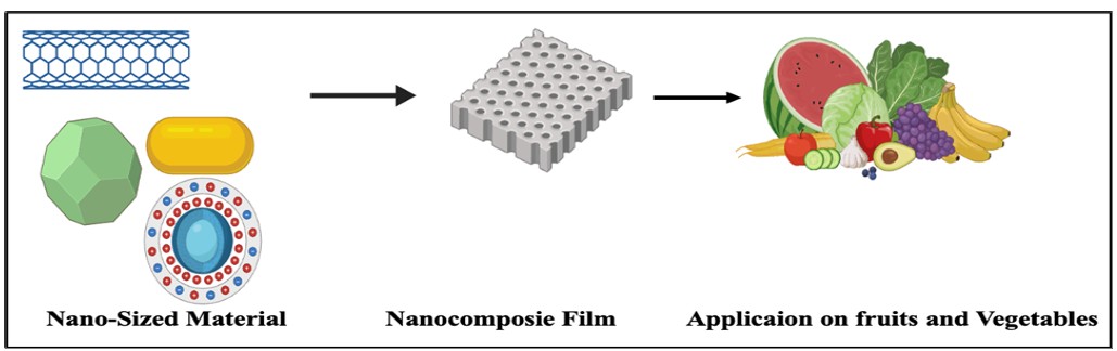 La nanotecnología se centra en materiales de tamaño inferior a 100 nm con una alta relación superficie-volumen, lo que ofrece un notable potencial industrial y científico (11). El nanoenvasado es uno de los nuevos enfoques utilizados en el envasado de alimentos para garantizar la seguridad. Puede ayudar a prevenir la putrefacción y los daños físicos en frutas y verduras durante el transporte (12). Numerosos estudios sugieren que el empleo de nanomateriales de embalaje mejora la calidad fisicoquímica y fisiológica en comparación con los materiales de embalaje estándar (9, 11).