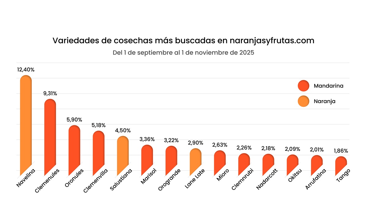 La plataforma de anuncio online de cosechas Naranjasyfrutas.com ha compartido las tendencias de las búsquedas por parte de los comercios mayoristas que compran este tipo de cosechas a los agricultores. Así, los resultados son los que se pueden observar en el gráfico que acompaña a esta información en el que se aprecia las variedades más demandadas durante los meses de Septiembre y Octubre por los comercios.