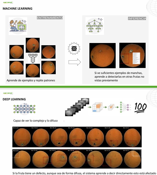 La IA ha mejorado la clasificación automática; sistemas de visión artificial identifican y descartan productos con defectos, asegurando una alta calidad homogénea en el producto final.