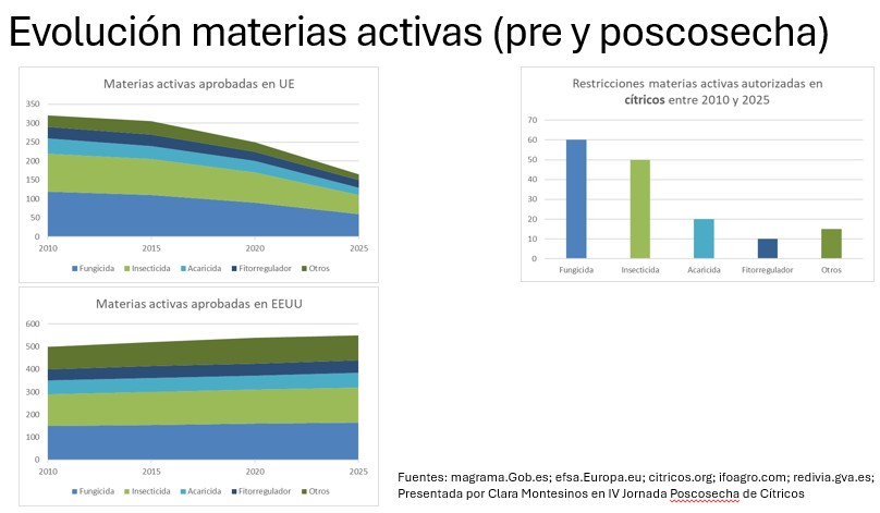 El número de fitosanitarios disponible disminuye y a ello no escapa la poscosecha, como evidenció Clara Montesinos, AgroFresh, en base a fuentes de magrama.Gob.es; efsa.Europa.eu; citricos.org; ifoagro.com; redivia.gva.es (presentación durante la IV Jornada Poscosecha de Cítricos).