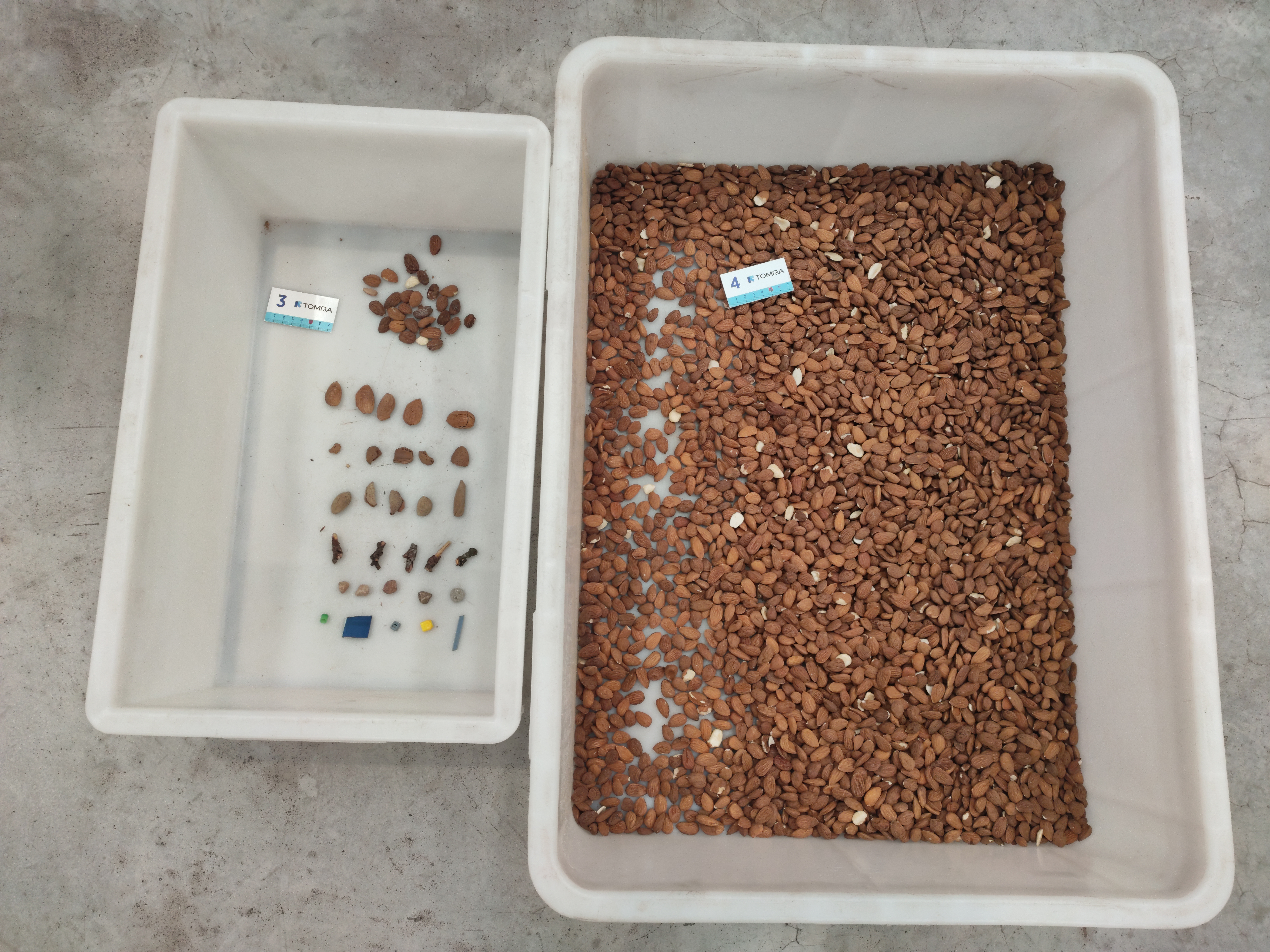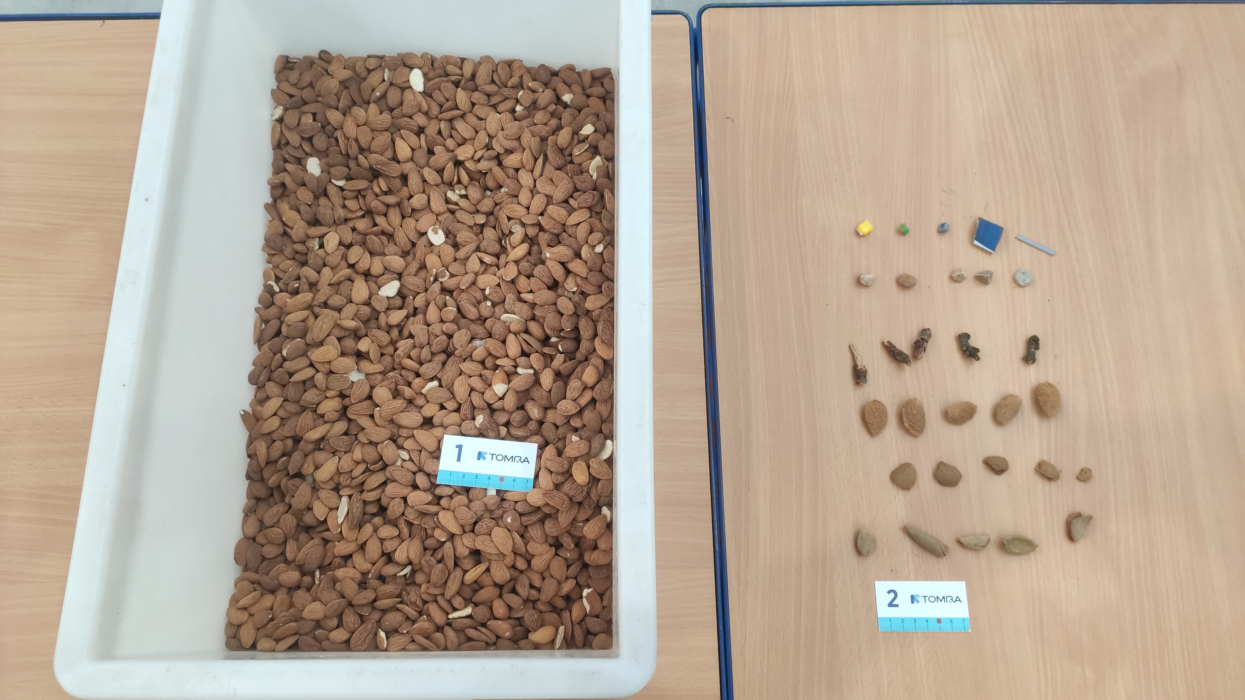 La sesión estuvo dirigida por Ender Elmas, Presales Engineer de TOMRA Food, quien explicó el funcionamiento del equipo antes de iniciar la demostración. Se preparó un lote de 5 kg de almendra al que se añadieron plásticos, piedras, ramitas, cáscaras, trozos de cáscara y pieles de almendra, simulando la presencia de contaminantes habituales en las líneas de procesado. Con la mezcla lista, el producto se introdujo en la clasificadora y la máquina realizó la separación en una única pasada.