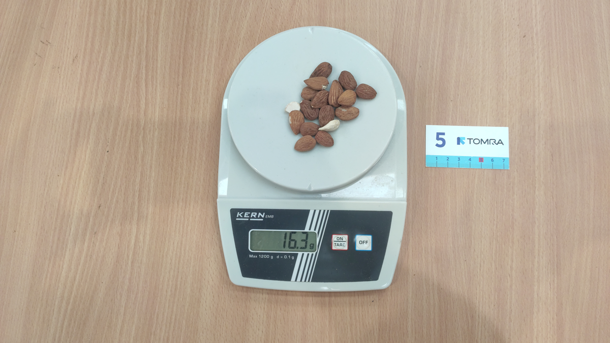 Tras la pasada, se realizó un recuento del material expulsado para calcular el falso rechazo, la cantidad de almendra buena que se separó junto a los defectos. El resultado fue de 16,3 gramos sobre 5 kg, equivalente a un 0,33%, un valor muy bajo y coherente con las cifras de rendimiento comunicadas por la compañía para frutos secos, con precisiones superiores al 97% y falsos rechazos por debajo del 1%.